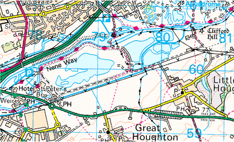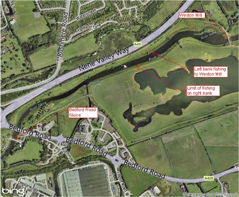 The left bank of the River Nene from a point downstream of the Bedford Road Sluice-gate to Weston Mill. The right bank of the River Nene from a point downstream of the Bedford Road Sluice-gate to a point level with the nearest point of the barrage lake to the river.