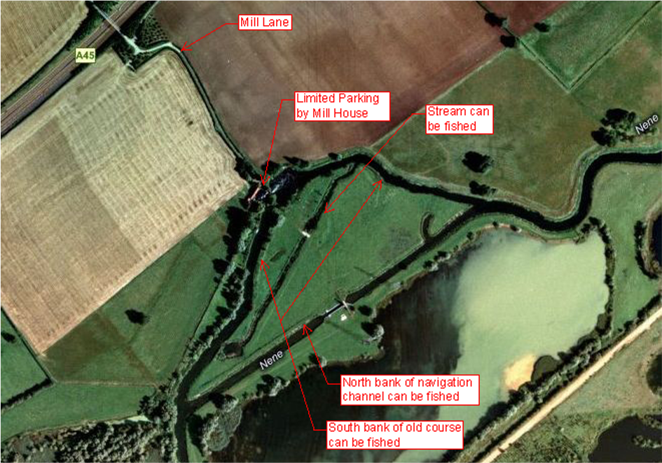 This fishery consists of the left bank of the navigation channel either side of the lock. The right bank of the backwater leading to Earl Barton Mill, upstream and downstream of the mill-race. The left bank of the backwater upstream of the mill-race. A short section of the left bank downstream of the mill-race and both banks of the small stream which flows across the “island”.