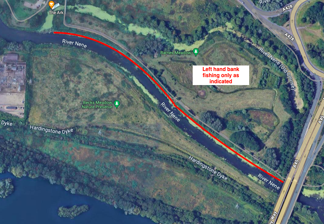 The fishery consists of Left bank fishing starting from where the main river and the inlet of the Dead Arm meet, downstream to the A45 road bridge (see Locate Us).