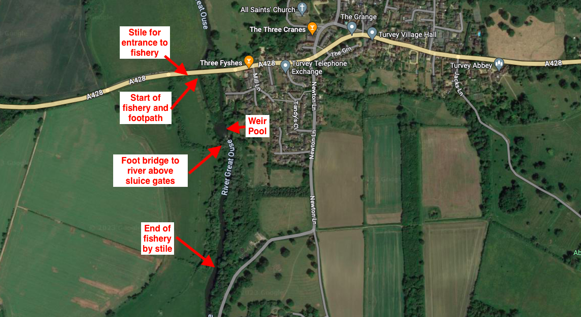 From the road bridge at Turvey the fishery consists of the right hand bank upstream to the weir pool then continues over the footbridge upstream to where a stile indicates the end of this section of the Ouse (see map for details). This is the point where our stretch of the river at Newton Blossomville meets this new section of river to become a joined up fishery.