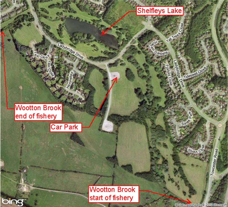 Wootton Brook is a tributary of the River Nene that flows into, and out of Shelfleys Lake (see Item 1.3). The fishery starts at the culvert under Towcester Road (near the Three Countries Crematorium) to a point close to where the brook enters a culvert under the A5123 dual carriageway (near Junction 15A of M1). Fishing permitted from both banks