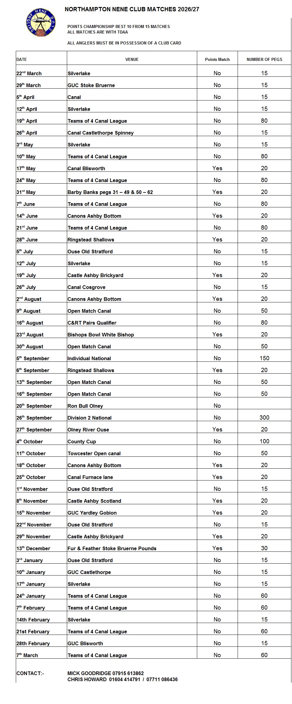The 14th club points match was held on the canal at Yardley Wharf yesterday with 17 fishing on a mild but wet day. The canal was very coloured but not flowing and fished reasonably well. 1st was Pete Laughton on peg 17 below tin bridge with 11 pounds 10 ounces of Skimmers and Roach on dead reds and Pinkies, 2nd Andy Webster on peg 14 with 10 pounds 8 ounces including a Perch of 2 pounds 13 ounces and a 2 pound hybrid on lobworm, 3rd John Balhatchet on peg 2 with 6 pounds 7 ounces of Perch and Skimmers. Sections were won by Brian Ayliff 6 pounds 6 ounces, Rob Pottinger 5 pounds 5 ounces and Chris Howard 4 pounds 8 ounces. The last points match will be held this Sunday 14th on the canal at Nether Heyford draw at Furnace Lane